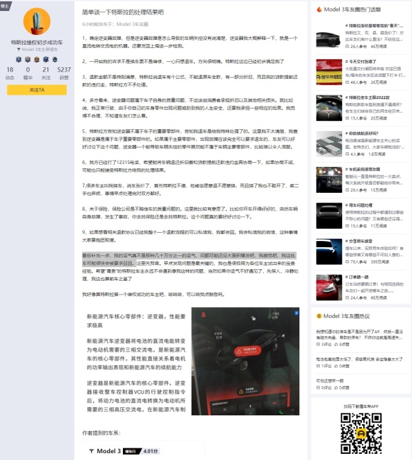 更让人惊讶的是,在6个小时之前,该车主发布了长文表示:“最后补充一点,我的运气真不是那种几十万分之一的运气,问题可能还没大面积爆发吧,我感觉吧,我这批车可能很快会被要求召回。”
