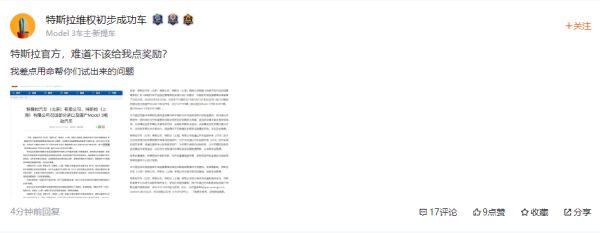 当天下午,在懂车帝Model 3车友圈发布“高速隧道失速”的车主更新自己的昵称为:特斯拉维权初步成功车,且发布最新动态为“特斯拉官方,难道不该给我点奖励?我差点用命帮你们试出来的问题。”前情回顾:车主曝特斯拉Model 3高速失速:隧道失去动力、踩电门无反应。
